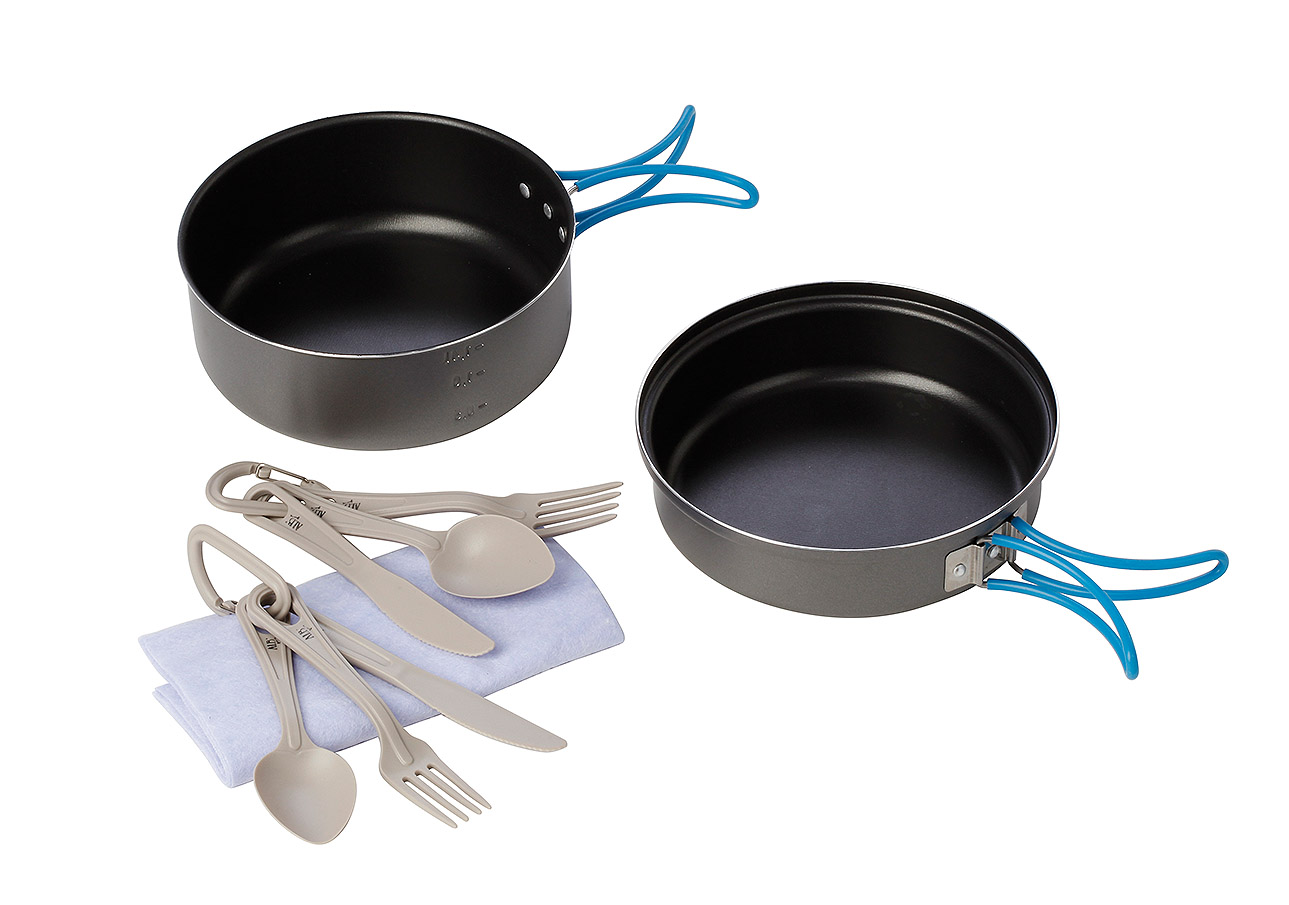 Campingová sada nádobí s nepřilnavým povrchem PTFE-vyrobena z povlakovaného hliníku.