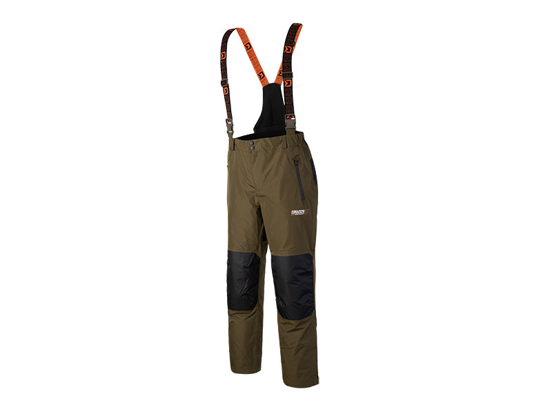 Jednou z hlavních výhod kalhot je vyvýšený pas v oblasti křížů, čímž bude spodní část vašich zad dokonale chráněna. V oblasti hýždí a kolen se nachází zesílená černá látka, jejímž úkolem je ochrana před znehodnocením, těchto používáním nejvíce náchylných částí kalhot. Zároveň efektně přispívá k celkovému designu, který dotváří i stylové kšandy s logy značky Delphin.